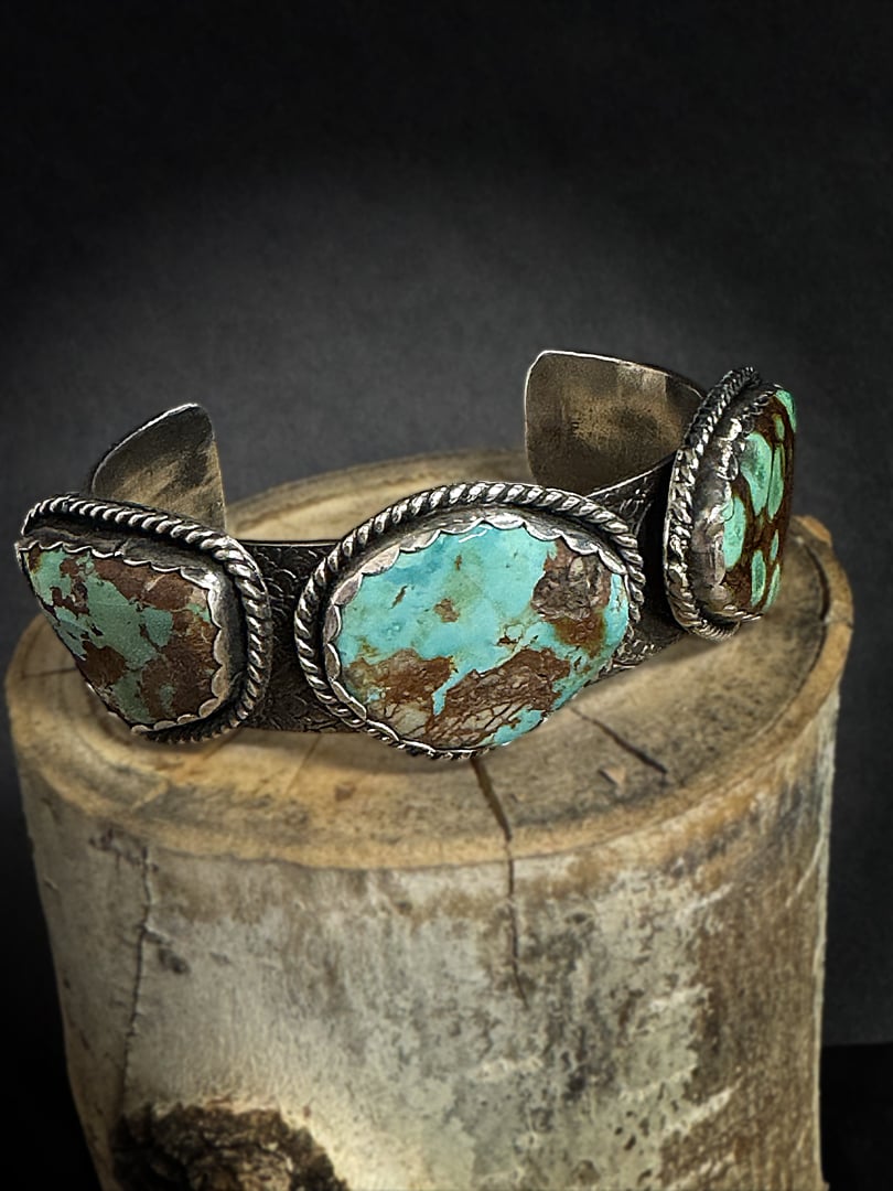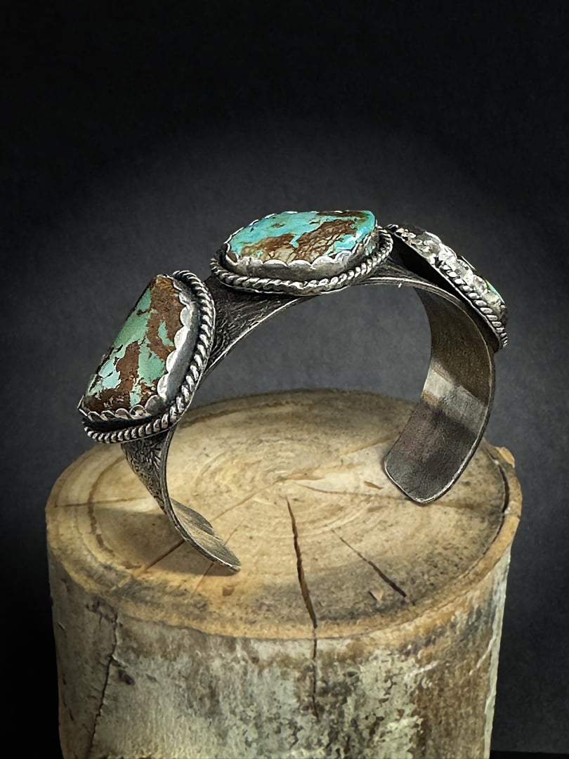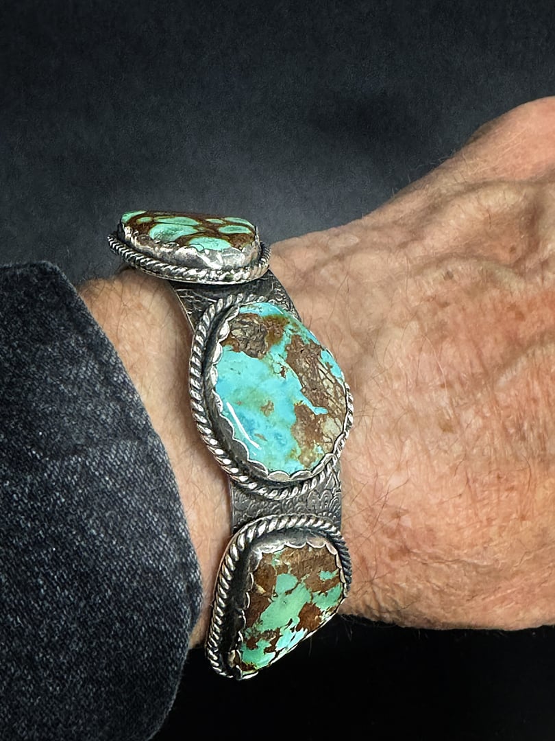 Earthy elegance meets bold craftsmanship in this statement cuff. Three richly patterned Royston turquoise cabochons take center stage, each framed in sterling silver to highlight their natural matrix and desert-blue tones. The stones rise from a solid sterling silver band that has been roller-printed with a subtle floral motif, adding texture, depth, and a quiet sense of movement beneath the bold forms above.
