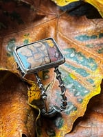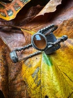 The opal is bezel-set in sterling silver and accented with sculptural wire wrapping that adds depth and texture from every angle. At each end of the cuff, warm carnelian cabochons glow like embers, bringing a subtle pop of color and balance to the design. Earthy, organic, and quietly bold—this piece is made to be worn and noticed.