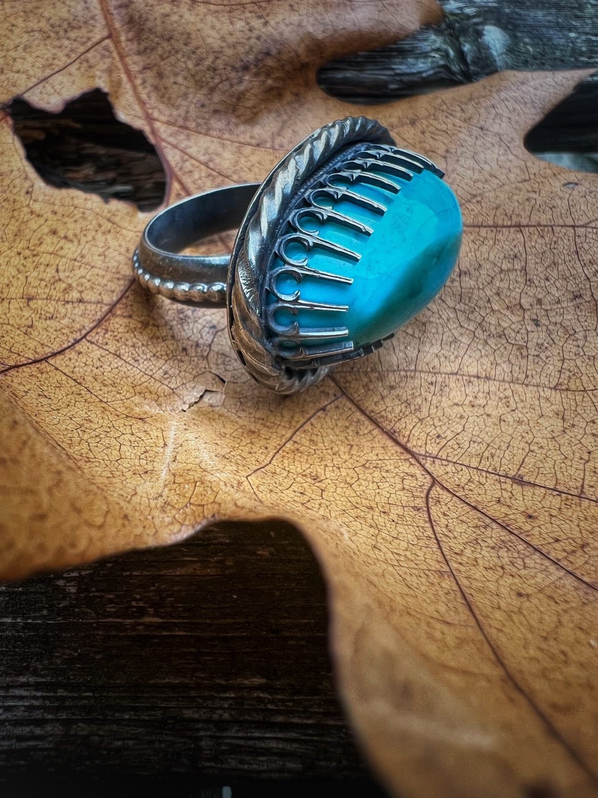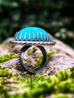 This striking statement ring is all about bold color and unexpected design. A large turquoise cabochon glows in vivid ocean blue, cradled in an eye-catching sterling silver bezel with intricate detailing. The stone sits sideways across the finger, creating a dramatic, sculptural silhouette that instantly stands out. Artistic, expressive, and full of personality—this is the ring you wear when you want your jewelry to start the conversation.