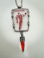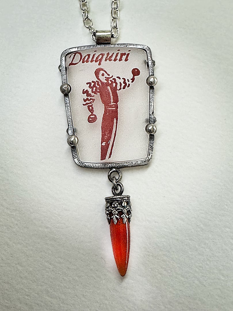 This playful pendant is crafted in sterling silver and features a slice of vintage cocktail shaker glass emblazoned with a whimsical “Daiquiri” figure. A cone-shaped Carnelian drop adds a splash of color and charm, bringing the whole piece to life. Whether you’re a Daiquiri devotee or a lover of cocktails in all their forms, this one-of-a-kind design serves up personality with style. Available with or without a sterling silver chain.
