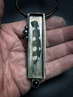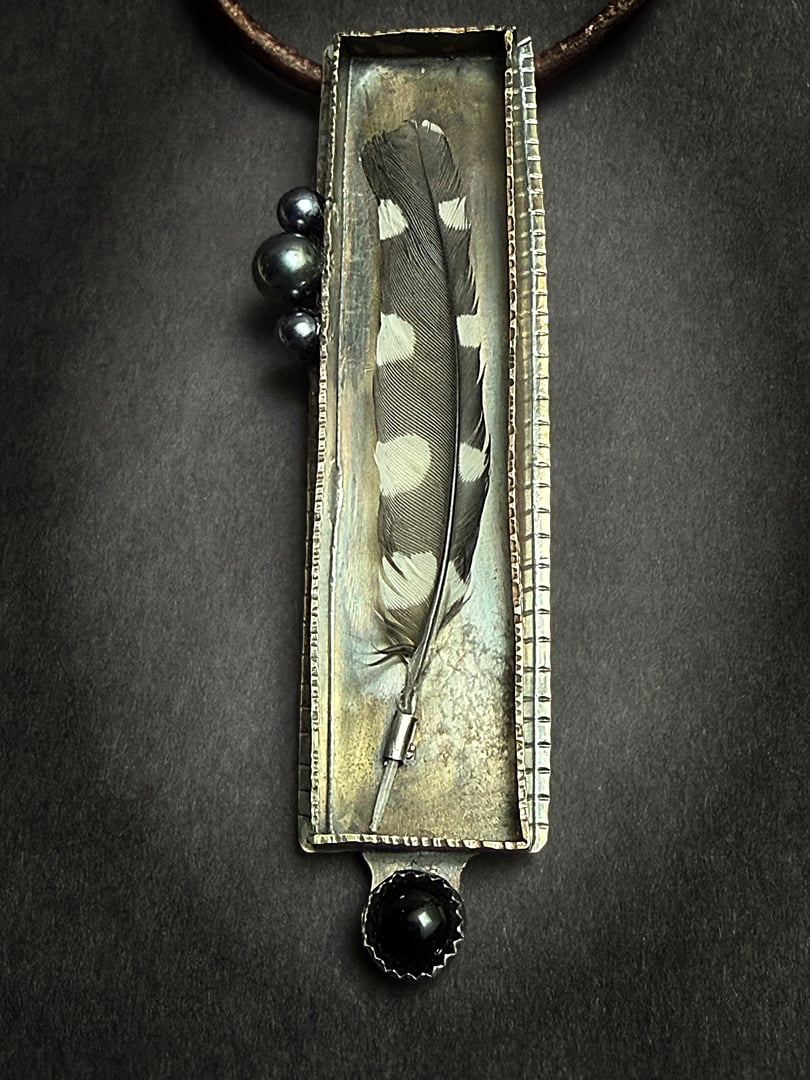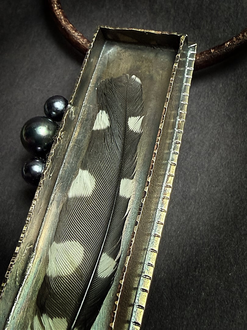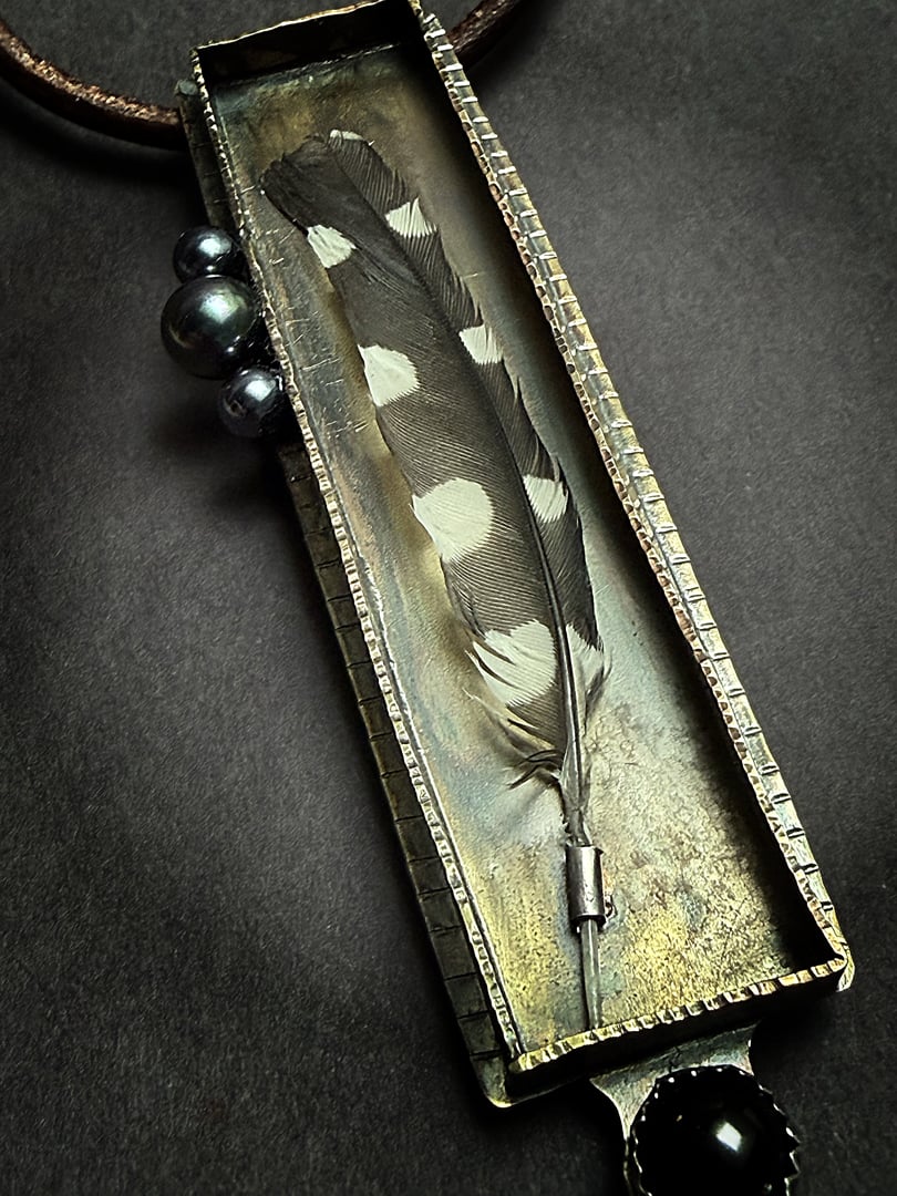This piece holds a juvenile spotted woodpecker feather—light, patterned, and impossibly delicate—protected within a hand-formed brass container. Like a fragment saved from the forest floor, it feels discovered rather than made. Subtle iridescence from imitation black pearls gathers along the side, while a deep black onyx anchors the piece with quiet weight.