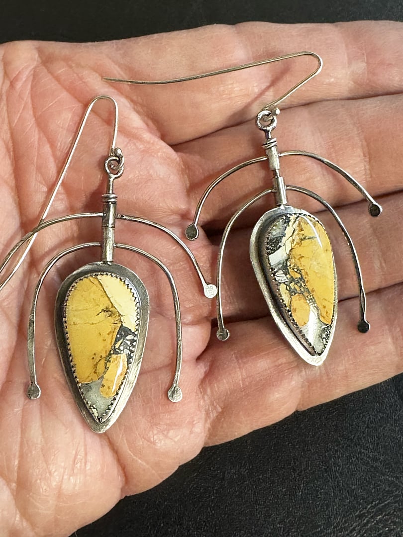 Handcrafted kinetic earrings in sterling silver featuring striking Maligano Jasper cabochons. The unique wire “wings” create fluid movement, catching the light and drawing the eye as they rotate around the stone. Measuring 2" (5cm) in length, these earrings are both bold and playful—perfect for making a statement.