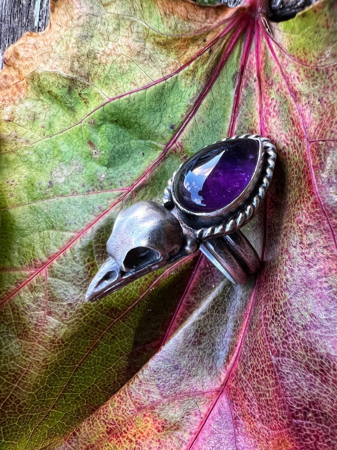 Embrace the mystery of the night with this bold, handcrafted sterling silver ring. A deep amethyst cabochon—rich in royal purple allure—is framed with twisted silver detailing, capturing the magic of twilight. Below it rests a meticulously cast raven skull, symbolizing wisdom, transformation, and the unseen. This one-of-a-kind piece is made for those who walk their own path and revel in the extraordinary.