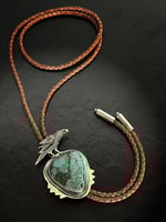 This one-of-a-kind bolo tie features a hand-pierced sterling silver raven clutching a 14k gold ball in its beak, perched above a striking Chinese Turquoise cabochon. The stone is set in sterling silver with bold, textured detailing that enhances its natural character. A braided leather cord and custom sterling silver tips complete this distinctive, wearable work of art.