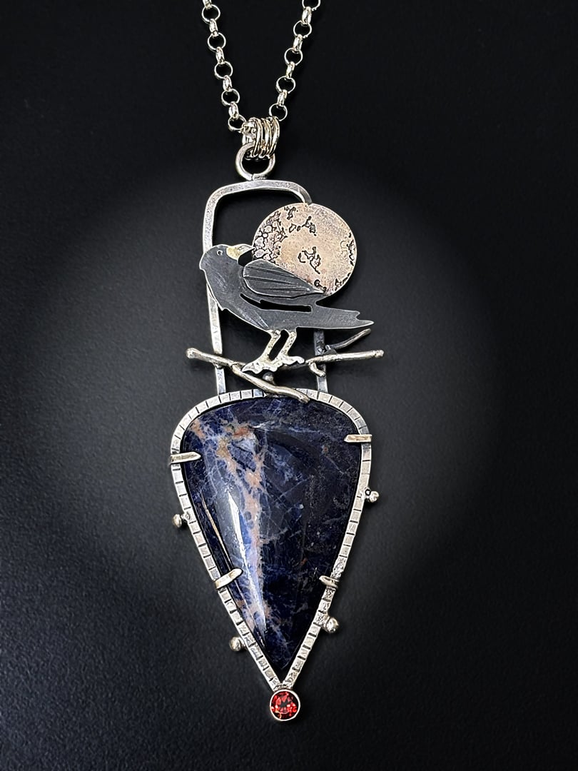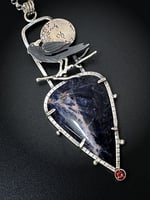 Below, a teardrop shaped Sodalite stone is cradled in a hand-fabricated sterling silver frame. A tube-set faceted garnet offers a final spark of fiery red, grounding the piece with warmth and vitality.