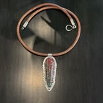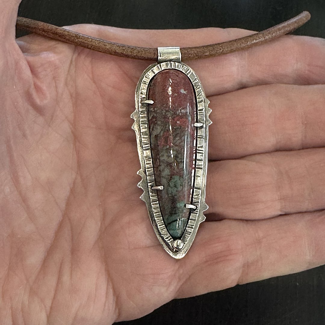 A striking teardrop-shaped Sonoran Sunrise cabochon takes center stage in this solid sterling silver pendant. The stone’s vivid blend of deep red and turquoise-green hues is framed by a textured bezel and secure prong setting for a bold yet refined look. Measuring 2.5" in length, the pendant hangs from an 18" leather cord finished with a handmade sterling clasp — a perfect balance of rustic charm and artisan elegance.