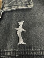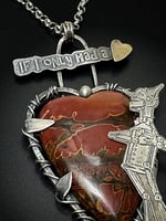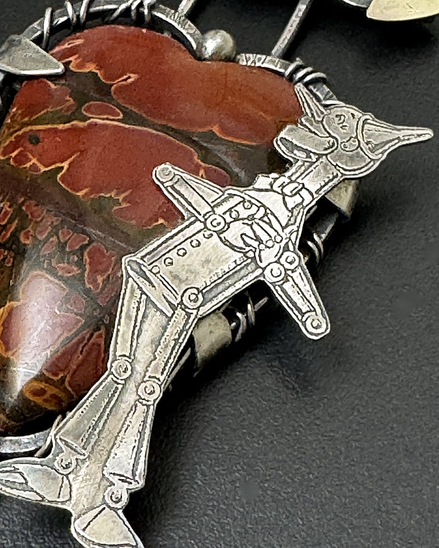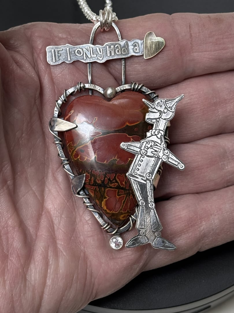The Tin Man is wishing for a heart for himself. This etched sterling silver Tin Man is standing next to a heart-shahped Cherry Creek Jasper specimen. This etched sterling silver Tin Man is a stand-alone brooch that can be worn separately or be fixed to the pendant.
