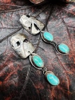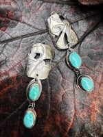 Art meets alchemy in these one-of-a-kind sterling silver earrings, crafted from free-form silver remnants reborn into sculptural, organic shapes. Below each abstract form, rich Royston turquoise cabochons sway with a natural, desert-kissed vibrance. Measuring 2.75" (7cm) in length, these earrings offer a bold, fluid movement that catches the eye even before the ear wires are added.